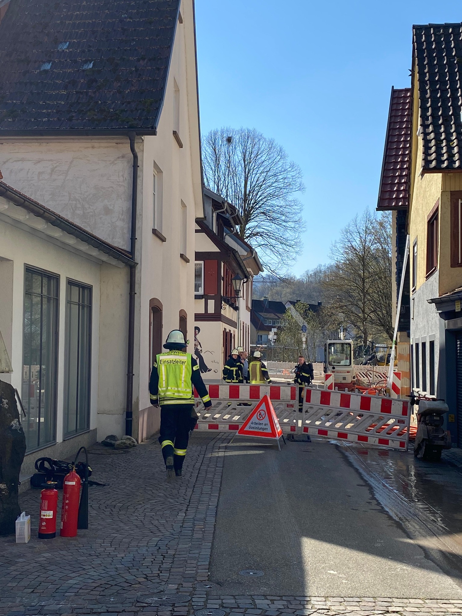 | Heute Vormittag wurde bei Bauarbeiten eine Gasleitung angebaggert. Da beim Eintreffen die Leckage bereits notdürftig durch den Bautrupp verschlossen war, sperrten wir den Gefahrenbereich weiträumig ab, stellten den Brandschutz sicher und überwachten den Gefahrenbereich, bis der Störungsdienst des Gasversorgers anwesend war und die Leitung gesichert hat. |