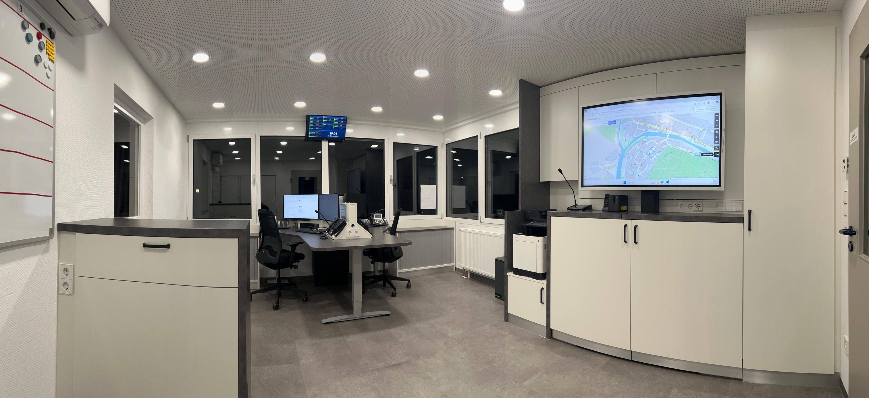 Im hinteren Bereich entstand ein Stabsraum, der mit Whiteboard und digitalem Flipchart ausgestattet ist. Er bietet die Möglichkeit, größere Einsatzlagen wie Hochwasser, Unwetter oder langandauernde Schadensereignisse strukturiert zu koordinieren.