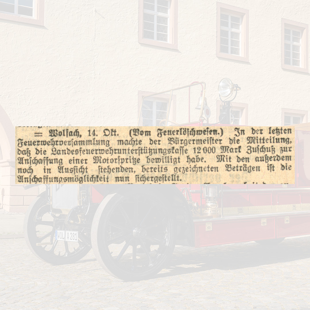 „In der letzten Feuerwehrversammlung machte der Bürgermeister die Mitteilung, dass die Landesfeuerwehrunterstützungskasse 12.000 Mark Zuschuss zur Anschaffung einer Motorspritze bewilligt habe. Mit den außerdem noch in Aussicht stehenden, bereits gezeichneten Beträgen ist die Anschaffungsmöglichkeit nun sichergestellt.“