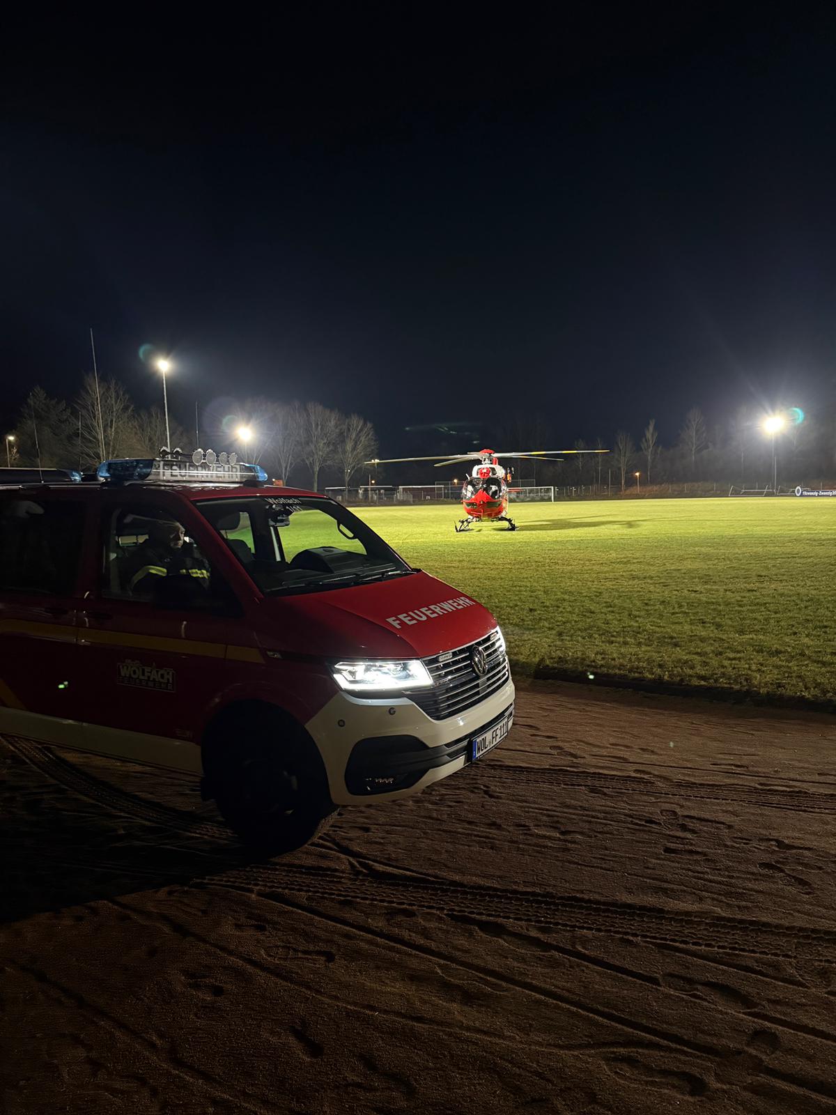 Ein Rettungshubschrauber der DRF Luftrettung wurde nach Wolfach angefordert. Um dem Piloten eine sichere Landung und einen sicheren Start zu ermöglichen, wurde der Sportplatz von uns ausgeleuchtet.